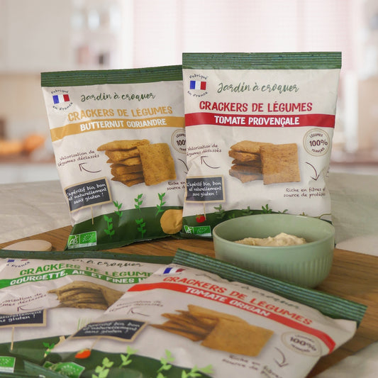 Jardin à Croquer ce sont des crackers de légumes bio fabriqués dans une démarche éco-responsable ! La marque récupère des légumes déclassés auprès des agriculteurs locaux de manière à valoriser leurs pertes et leur travail. Cela lui permet de fabriquer des produits savoureux tout en aidant les producteurs !
